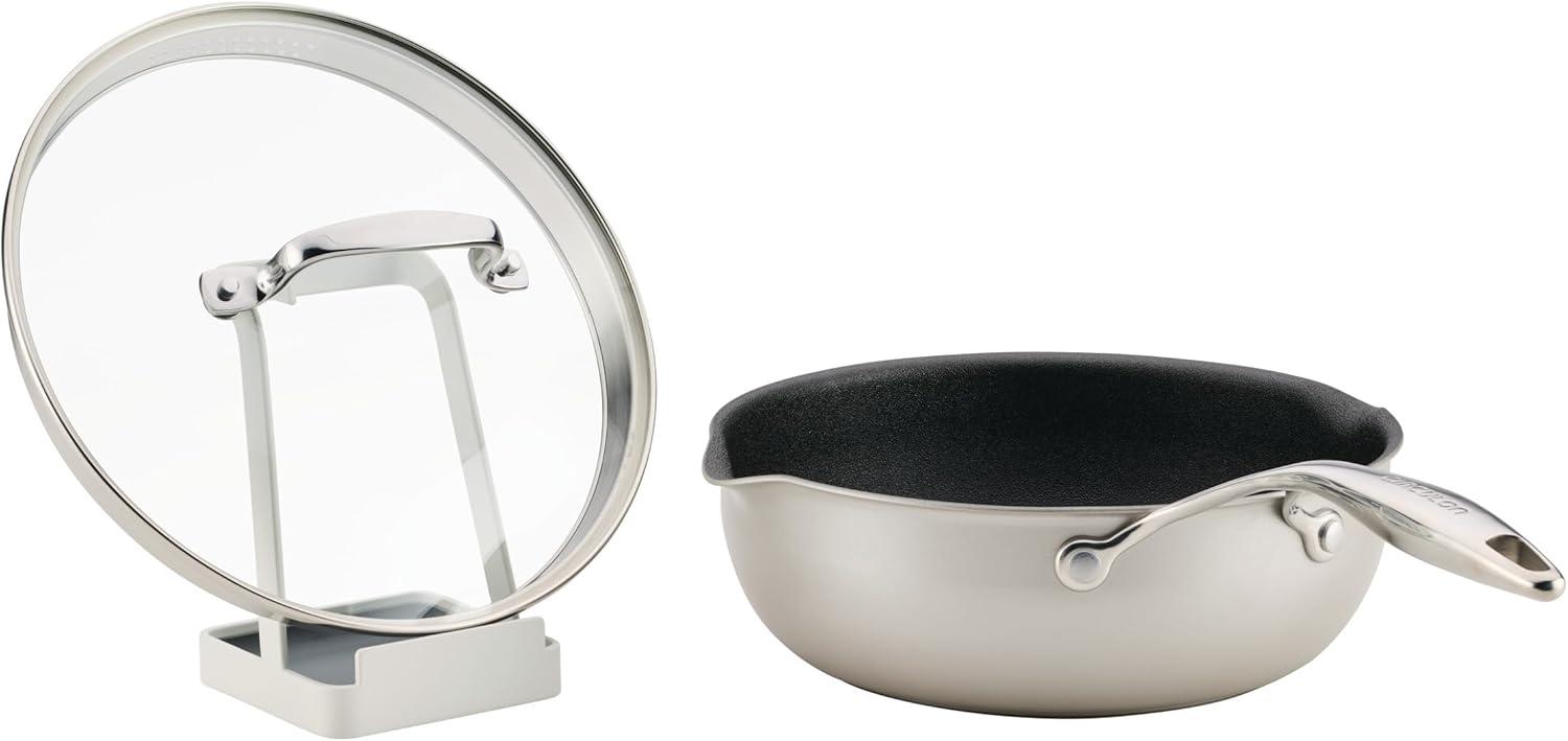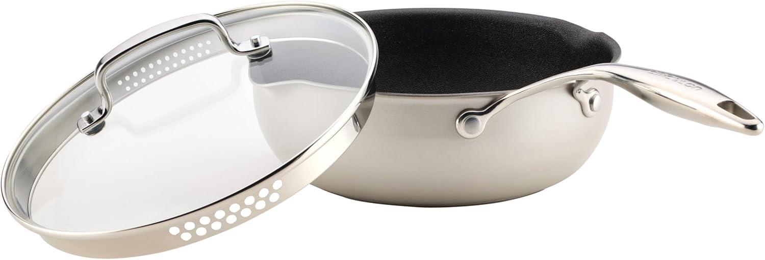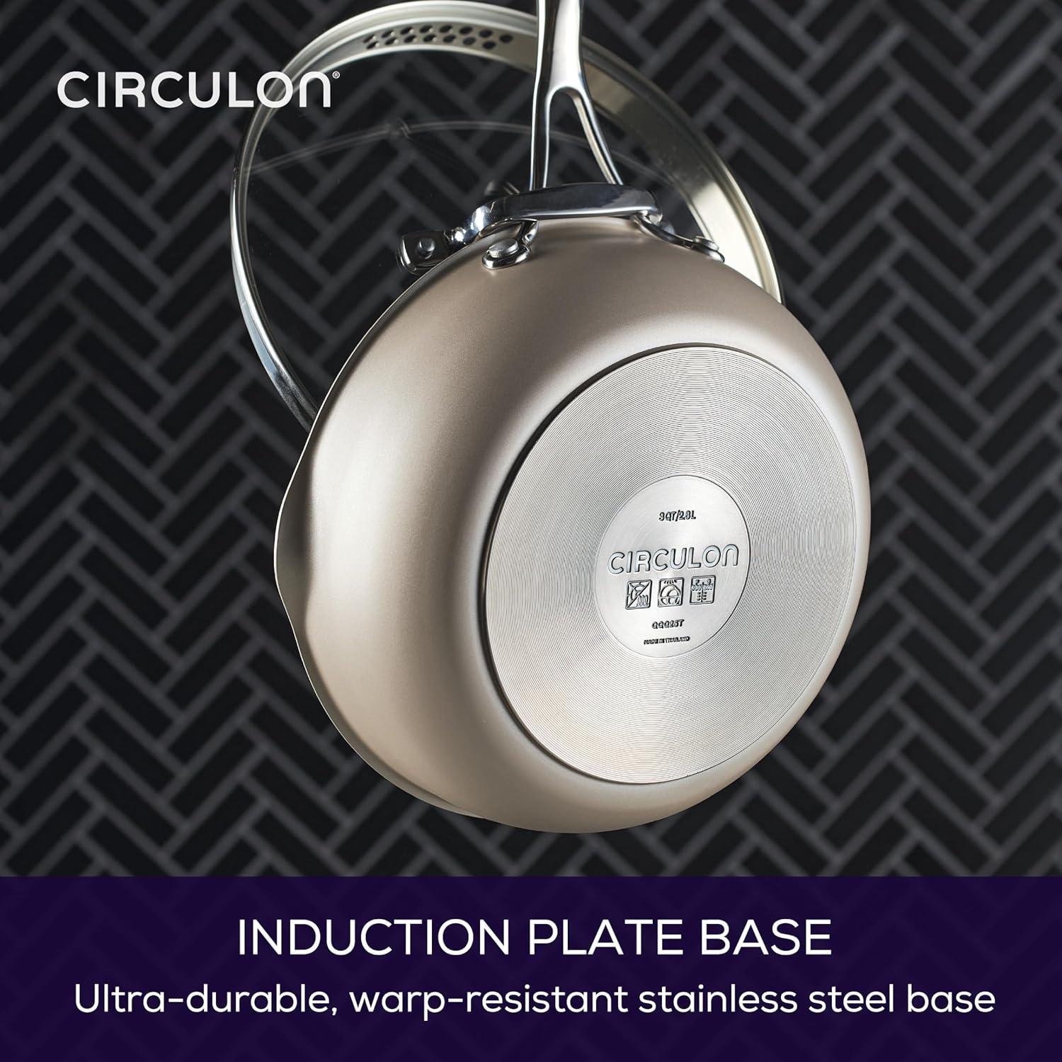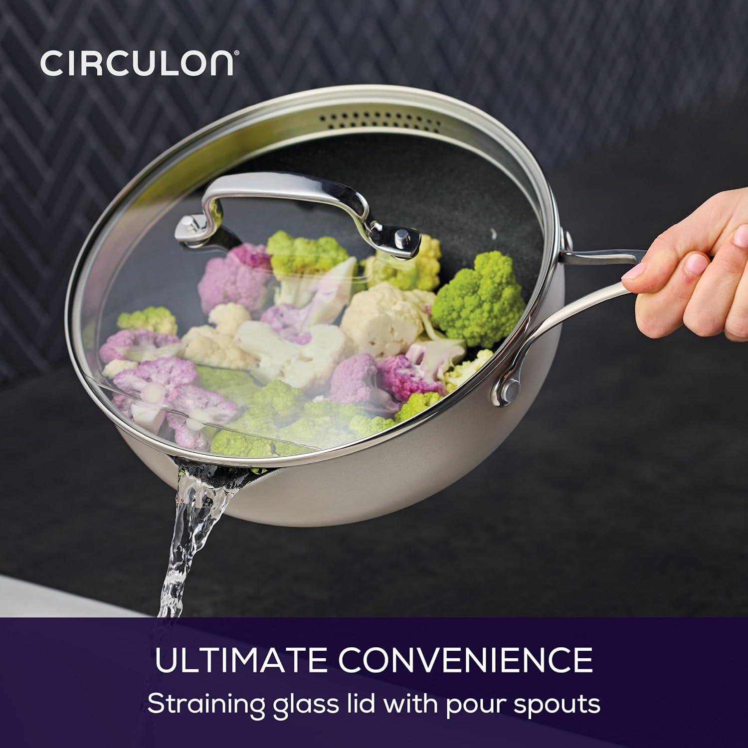 Clear out your overcrowded cabinet and replace every pot, pan, and lid with the Circulon Infinity Pan-the greatest all-in-one nonstick pan ever made. Engineered to do it all, the Infinity Pan handles everything from searing and sautéing to boiling, frying, steaming, straining, baking, and beyond. Built with ScratchDefense, Circulon’s toughest nonstick yet, the Infinity Pan is metal-utensil safe and 130x longer lasting than traditional nonstick*. It stands up to high heat and daily use without flaking, scratching, or sticking. The Infinity Pan is 70% deeper than the average frying pan and delivers 50% more capacity for big-batch meals, with a 9.5-inch wide, flat cooking surface for faster heating and perfect searing. Dual pour spouts and a straining lid make draining easy, while flush rivets and rounded sidewalls prevent messes and make stirring effortless. Oven-safe to 500 F (glass lid to 350 F), dishwasher-safe, and induction compatible, it even comes with a multipurpose countertop stand for your lid, utensils, tablet, or recipes. Circulon Infinity Pan. One pan. Endless possibilities. *Than leading competitor nonstick in a metal utensil scratch test performed at 200C/392F.